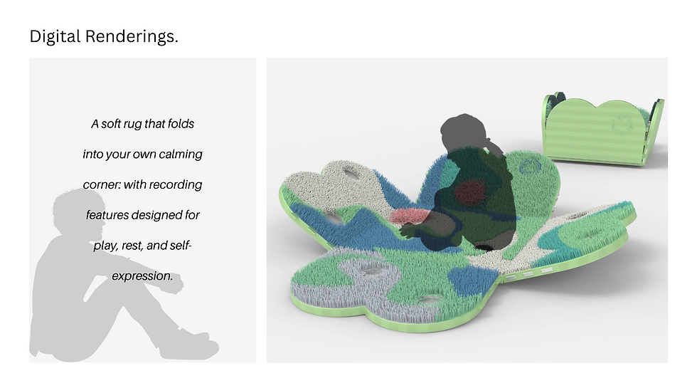 This project is a soft, foldable sensory rug designed for children aged 3–6 with ADHD. It transforms into a personal calming corner at home, offering a safe space for rest, play, and self-regulation.